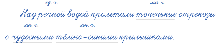 Над речной (ед. ч.) водой пролетали тоненькие (мн. ч.) стрекозы с чудесными (мн. ч.) темно-синими (мн. ч.) крылышками.