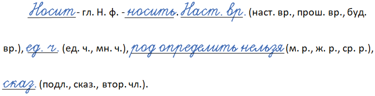 ___ - гл. Н. ф. - ___. ___ (наст. вр., прош. вр., буд. вр.), ___ (ед. ч., мн. ч.), ___ (м. р., ж. р., ср. р.), ___ (подл., сказ., втор. чл.).