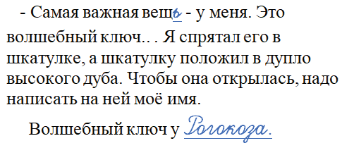 — Самая важная вещ.. — у меня. Это волшебный ключ.. . Я спрятал его в шкатулке, а шкатулку положил в дупло высокого дуба. Чтобы она открылась, надо написать на ней моё имя.