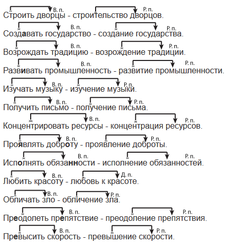 Строить дворцы. Создавать государство. Возрождать традицию. Развивать промышленность. Изучать музыку. Получить письмо. Концентрировать ресурсы. Про..влять добр..ту. Исп..лнять обяза(н, нн)ости. Любить красоту. Обличать зло. Пр..одолеть пр..пятствие. Пр..высить скорость.