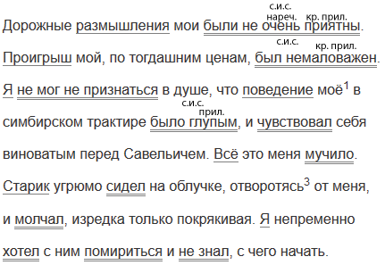 Дорожные размышления мои были не очень приятны. Проигрыш мой, по тогдашним ценам, был немаловажен. Я не мог не признаться в душе, что поведение моё1 в симбирском трактире было глупым, и чувствовал себя виноватым перед Савельичем. Всё это меня мучило. Старик угрюмо сидел на облучке, отворотясь3 от меня, и молчал, изредка только покрякивая. Я непременно хотел с ним помириться и не знал, с чего начать.