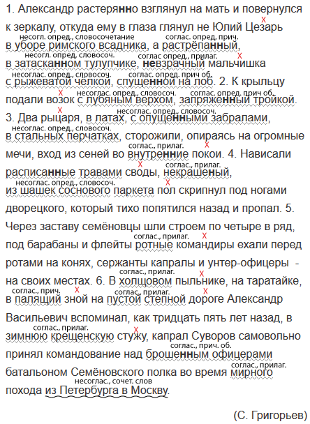 1. Александр растеря(н, нн)о взглянул на мать и повернулся к зеркалу откуда ему в глаза глянул не Юлий Цезарь в уборе римского всадника а растрёпа(н, нн)ый в затаска(н, нн)ом тулупчике (не)взрачный мальчишка с рыжеватой чёлкой спуще(н, нн)ой на лоб. 2. К крыльцу подали возок с лубяным верхом запряжё(н, нн)ый тройкой. 3. Два рыцаря в латах с опуще(н, нн)ыми забралами в стальных перчатках сторожили опираясь на огромные мечи вход из сеней во внутре(н, нн)ие покои. 4. Нависали расписа(н, нн)ые травами своды некраше(н, нн)ый из шашек соснового паркета пол скрипнул под ногами дворецкого который тихо попятился назад и пропал. 5. Через заставу семёновцы шли строем по четыре в ряд, под барабаны и флейты ротные командиры ехали перед ротами на конях сержанты капралы и унтер-офицеры на своих местах. 6. В холщовом пыльнике, на таратайке, в палящий зной на пустой степной дороге Александр Васильевич вспоминал как тридцать пять лет назад, в зимнюю крещенскую стужу, капрал Суворов самовольно принял командование над броше(н, нн)ым офицерами батальоном Семёновского полка во время мирного похода из Петербурга в Москву.