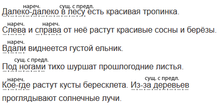 Составьте 5—6 предложений на тему «Тропинка (дорога, аллея), которая мне запомнилась». Используйте, если потребуется, некоторые из следующих слов: слева, справа, впереди, вдали, далеко-далеко, под ногами, над головой, кое-где, гам, тут, из-за деревьев. Подчеркните обстоятельства места. Какими частями речи они выражены?