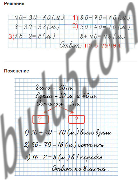 26. В двух коробках было 86 теннисных мячей. Когда из одной коробки взяли 30 мячей, а из другой - 40, то мячей в двух коробках стало поровну. Сколько мячей стало в каждой коробке?