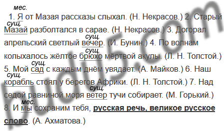 1. Я от Мазая рассказы слыхал. (Н. Некрасов.) 2. Старый Мазай разболтался в сарае. (Н. Некрасов.) 3. Догорал апрельский светлый вечер. (И. Бунин.) 4. По волнам колыхалось жёлтое брюхо мёртвой акулы. (Л. Н. Толстой.) 5. Мой сад с каждым днём увядает. (А. Майков.) 6. Наш корабль стоял у берегов Африки. (Л. Н. Толстой.) 7. Над седой равниной моря ветер тучи собирает. (М. Горький.) 8. И мы сохраним тебя, русская речь, великое русское слово. (А. Ахматова.)