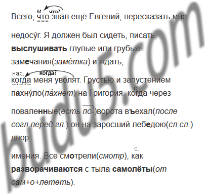 1) Всего что знал ещё Евгений пересказать мне недосу́г. (А. Пушкин) 2) Я должен был сидеть писать выслушивать глупые или грубые зам..чания и ждать когда меня уволят. (А. Чехов) 3) Грустью и запустением п..хну́ло на Григория когда через повале..ые ворота в..ехал он на заросший леб..дою двор имения. (М. Шолохов) 4) Все см..трели как разворачиваются с тыла с..молёты. (К. Федин)