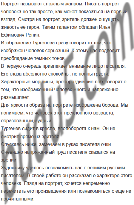 Рассмотрите на вклейке (с. 11) репродукцию портрета И. С. Тургенева, созданного Ильёй Ефимовичем Репиным (1844—1930). Попробуйте сами написать словесный портрет великого писателя.
