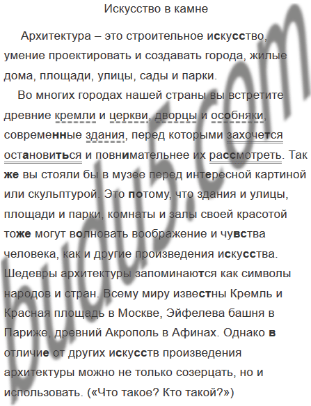 Во многих городах нашей страны вы встретите древние кремли и церкви дворцы и ос..бняки совреме(н, нн)ые здания, перед которыми захоче(т, ть)ся ост..нови(т, ть)ся и повн..мательнее их ра(с, сс)мотреть. Так (же) вы стояли бы в музее перед инт..ресной картиной или скульптурой. Это (по) тому, что здания и улицы площади и парки комнаты и залы своей красотой то (же) могут в..лновать воображение и чу(вс, с)тва человека, как и другие произведения и(с, сс)ку(с, сс)тва. Шедевры архитектуры запоминаю(т, ть)ся как символы народов и стран. Всему миру изве(с, ст)ны Кремль и Красная площадь в Москве Эйфелева башня в Париже древний Акрополь в Афинах. Однако (в) отличи(и, е) от других и(с, сс)ку(с, сс)тв произведения архитектуры можно не только созерцать но и использовать. («Что такое? Кто такой?»)