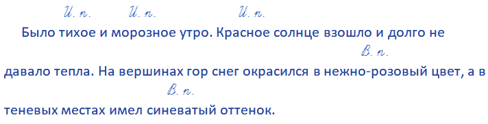 Было тих... и морозн... утро красн... солнце3 взошло и долго не давало тепла на вершинах гор снег окрасился в нежно-розов... цвет, а в теневых местах имел синеват... оттенок.
