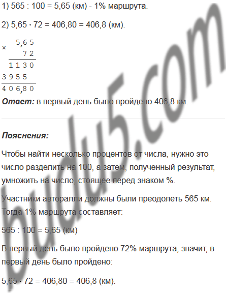 Участники авторалли должны были преодолеть 565 км. В первый день было пройдено 72% маршрута. Сколько километров было пройдено в первый день?