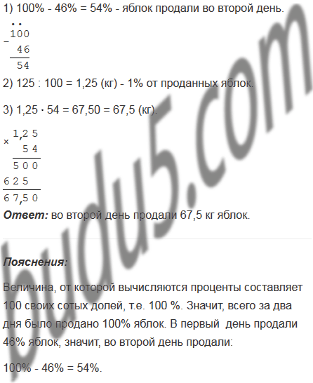 За два дня продали 125 кг яблок, причем в первый день продали 46% яблок. Сколько килограммов яблок продали во второй день.