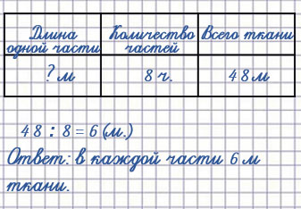 В ателье имеется 48 м ткани. Сколько метров ткани получится в каждой части, если всю имеющуюся ткань разделить на 8 равных частей?