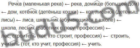 Речка ← река, домище ← дом, котёнок ← кот, лисёнок ← лиса, школьник ← школа, лесник ← лес, строитель ← строить, учитель ← учить.