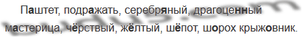 П..штет, подр..жать, серебр..ный, драгоце(н,нн)ый м..стерица, ч..рствый, ж..лтый, ш..пот, ш..рох крыж..вник.
