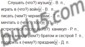 Слушать (музыка), играть в (война), писать (чернила), мечтать о (торт), встретиться после (каникулы), сидеть между (брат) и (сестра), подарить к (праздник).