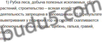 1) Рубка леса, добыча полезных ископаемых, сбор растений, строительство всякая хозяйственная деятельность запрещена в заповедниках. 2) В результате выветривания у подножия гор на склонах скапливаются обломочные горные породы щебень галька гравий песок