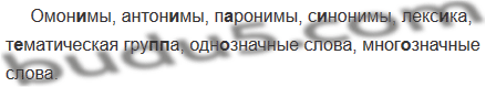 Омон..мы, антон..мы, п..ронимы, с..нонимы, лекс..ка, т..матическая гру(п, пп)а, одн..значные слова, мног..значные слова.