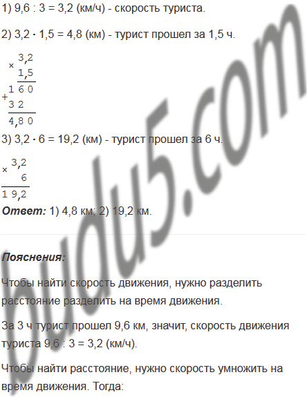За 3 ч турист прошел 9,6 км. Сколько километров он пройдет с той же скоростью: 1) за 1,5 ч; 2) за 6 ч?
