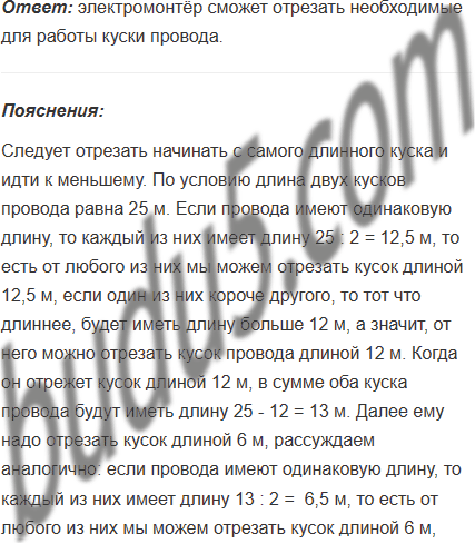 У электромонтёра есть два куска провода, общая длина которых 25 м. От них он планирует отрезать необходимые для работы куски в 1 м, 2 м, 3 м, 6 м, 12 м. Сможет ли электромонтёр отрезать необходимые для работы куски провода?