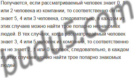 Докажите, что в любой компании из шести человек найдется трое попарно знакомых или трое попарно незнакомых.