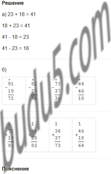 а) Составь все возможные равенства из чисел 23, 18, 41. Какими способами можно проверить правильность решения примеров на сложение, примеров на вычитание.
