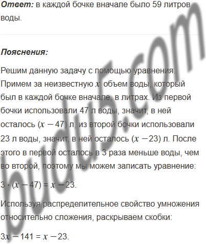 В две бочки для полива огорода налили одинаковое количество воды. Когда из первой бочки использовали 47 л воды, а из второй - 23 л, то в первой осталось в 3 раза меньше воды, чем во второй. Сколько литров воды было в каждой бочке вначале?