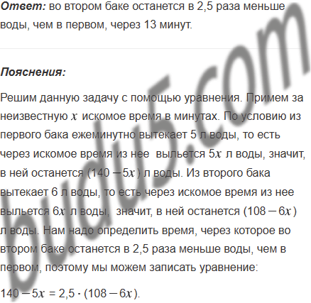 В одном баке было 140 л воды, а в другом - 108 л. В баках одновременно открыли краны. Из первого бака ежеминутно вытекает 5 л воды, а из второго - 6 л. Через сколько минут во втором баке останется в 2,5 раза меньше воды, чем в первом?