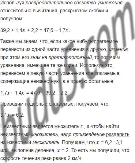 Лодка плыла 1,4 ч по течению реки и 1,7 ч против течения. Путь, который проплыла лодка по течению, оказался на 2,2 км меньше пути, который она проплыла против течения. Найдите скорость течения реки, если скорость лодки в стоячей воде 28 км/ч.