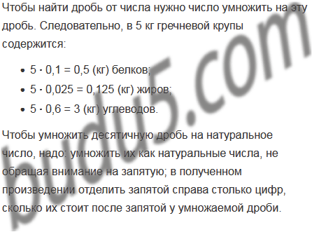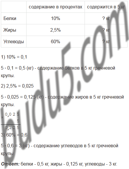 Известно, что 10% гречневой крупы составляют белки, 2,5% - жиры и 60% - углеводы. Сколько каждого из этих продуктов содержится в 5 кг гречневой крупы?