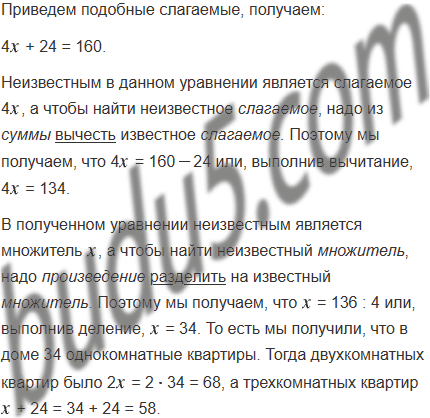 В доме 160 квартир трёх видов: однокомнатные, двухкомнатные и трёхкомнатные. Однокомнатных квартир в 2 раза меньше, чем двухкомнатных, и на 24 меньше, чем трёхкомнатных. Сколько в дома квартир каждого вида?