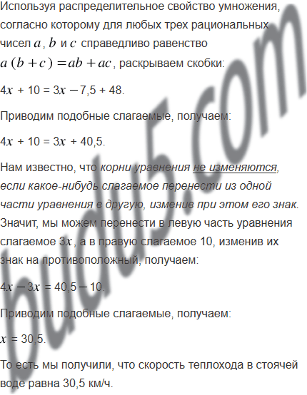 Теплоход прошёл 4 ч по течению реки и 3 ч против течения. Путь, пройденный теплоходом по течению, на 48 км больше пути против течения. Найдите скорость теплохода в стоячей воде, если скорость течения равна 2,5 км/ч.