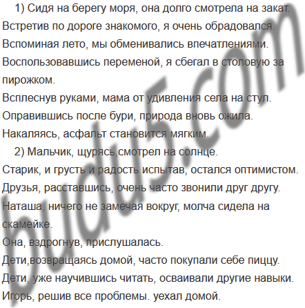 1) Сидя на берегу моря, встретив по дороге знакомого, вспоминая лето, воспользовавшись переменой, всплеснув руками, оправившись после бури, накаляясь.