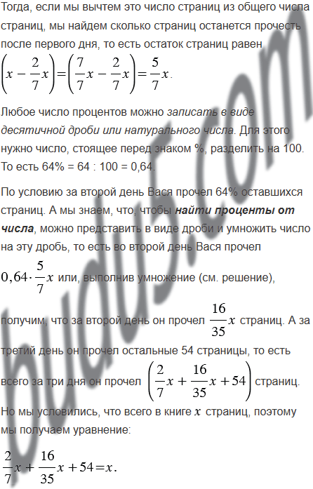 За первый день Вася прочёл страниц книги, за второй - 64% оставшихся,  а за третий - остальные 54 страницы. Сколько страниц в книге?