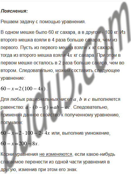 В одном мешке было 60 кг сахара, а в другом - 100 кг. Когда из второго мешка взяли в 4 раза больше сахара, чем из первого, то в первом осталось в 2 раза больше сахара, чем во втором. Сколько килограммов сахара взяли из каждого мешка?