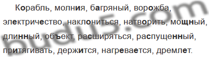 К..рабль, молн..я, б..гряный, вор..жба, эл..ктрич..ство, накл..ниться, натв..рить, мощ(?)ный, дли(н,нн)ый, об(?)ект, ра(з,с)ширяться, ра(с,з)пуще(н,нн)ый, пр..тягивать, держ..тся, нагр..ва..тся, дремл..т.