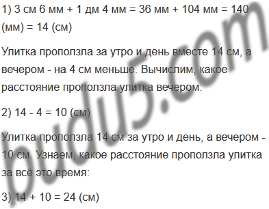Задание № 9. Улитка проползла утром 3 см 6 мм, днём - 1 дм 4 мм, а вечером - на 4 см меньше, чем утром и днём вместе. Какое расстояние проползла улитка за всё это время?