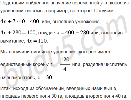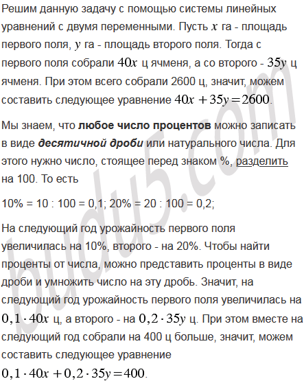 С одного поля собрали по 40 ц ячменя с гектара, а с другого - по 35 ц с гектара. Всего собрали 2600 ц. На следующий год урожайность первого поля увеличилась на 10%, второго - на 20%, а в результате вместе собрали на 400 ц больше. Найдите площадь каждого поля.