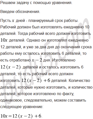 Рабочий должен был изготовлять ежедневно 10 деталей. Однако он изготовлял ежедневно 12 деталей, и уже за два дня до окончания срока работы ему осталось изготовить 6 деталей. Сколько деталей должен был изготовить рабочий?