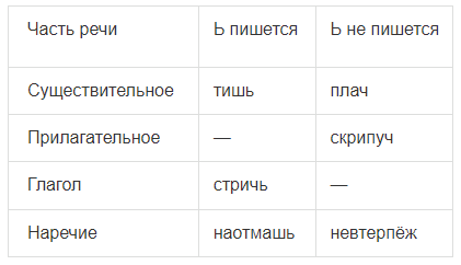 | Часть речи | Ь пишется | Ь не пишется |