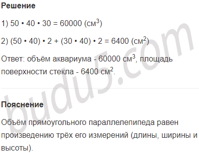 Задание № 7. Аквариум имеет форму прямоугольного параллелепипеда. Длина аквариума - 50 см, ширина - 35 см, а высота - 40 см. Его боковые стенки стеклянные. Определи площадь поверхности стекла и объём аквариума.