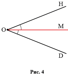 Биссектриса - луч, который делит угол на два равных угла. На рис. 4 углы НОМ и DОМ равны, значит, луч ОМ - биссектриса угла НОD.