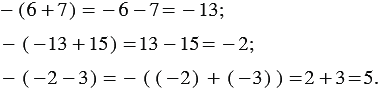 | Чтобы записать сумму, противоположную сумме нескольких слагаемых, надо изменить знаки данных слагаемых.