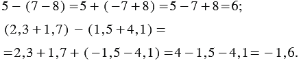| Если перед скобками стоит знак "+", то можно опустить скобки и этот знак "+", сохранив знаки слагаемых, стоящих в скобках. Если первое слагаемое в скобках записано без знака, то его надо записать со знаком "+". |