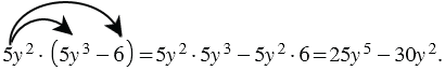 | Чтобы умножить одночлен на многочлен, нужно умножить этот одночлен на каждый член многочлена и полученные произведения сложить. |